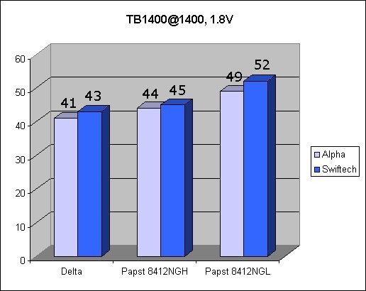 Vakiokelloilla Alpha voittaa Swiftechin jokaisella tuulettimella muutamalla asteella. Kellotettuna Swiftech